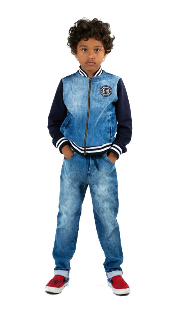 Jaqueta confeccionada em jeans macio, com fechamento em ziper, bordado frontal.