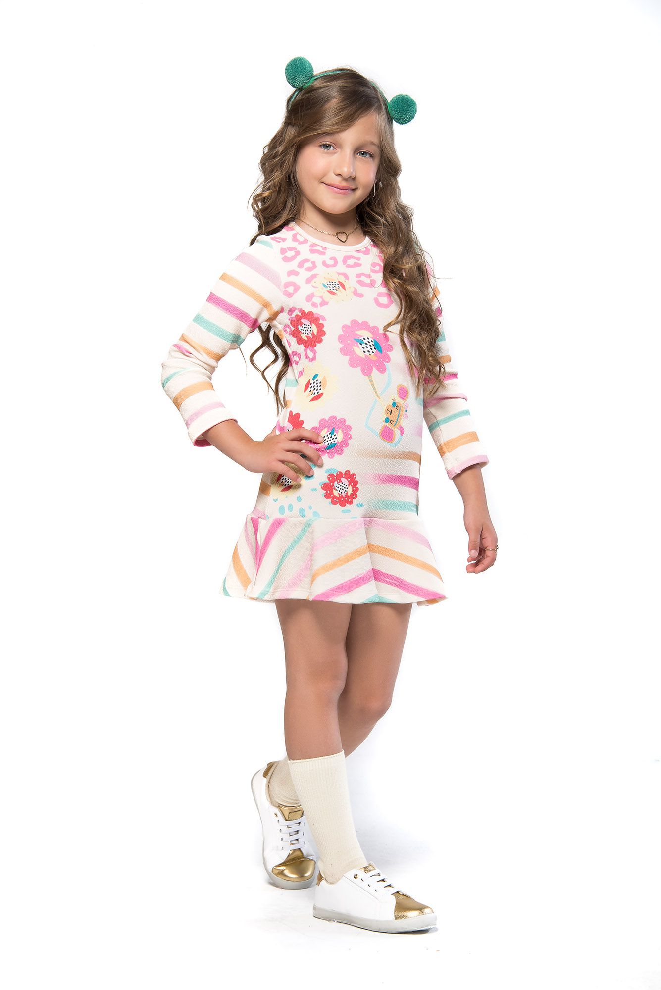 Vestido com estampa listrada, floral, com babados na barra, gola redonda.
