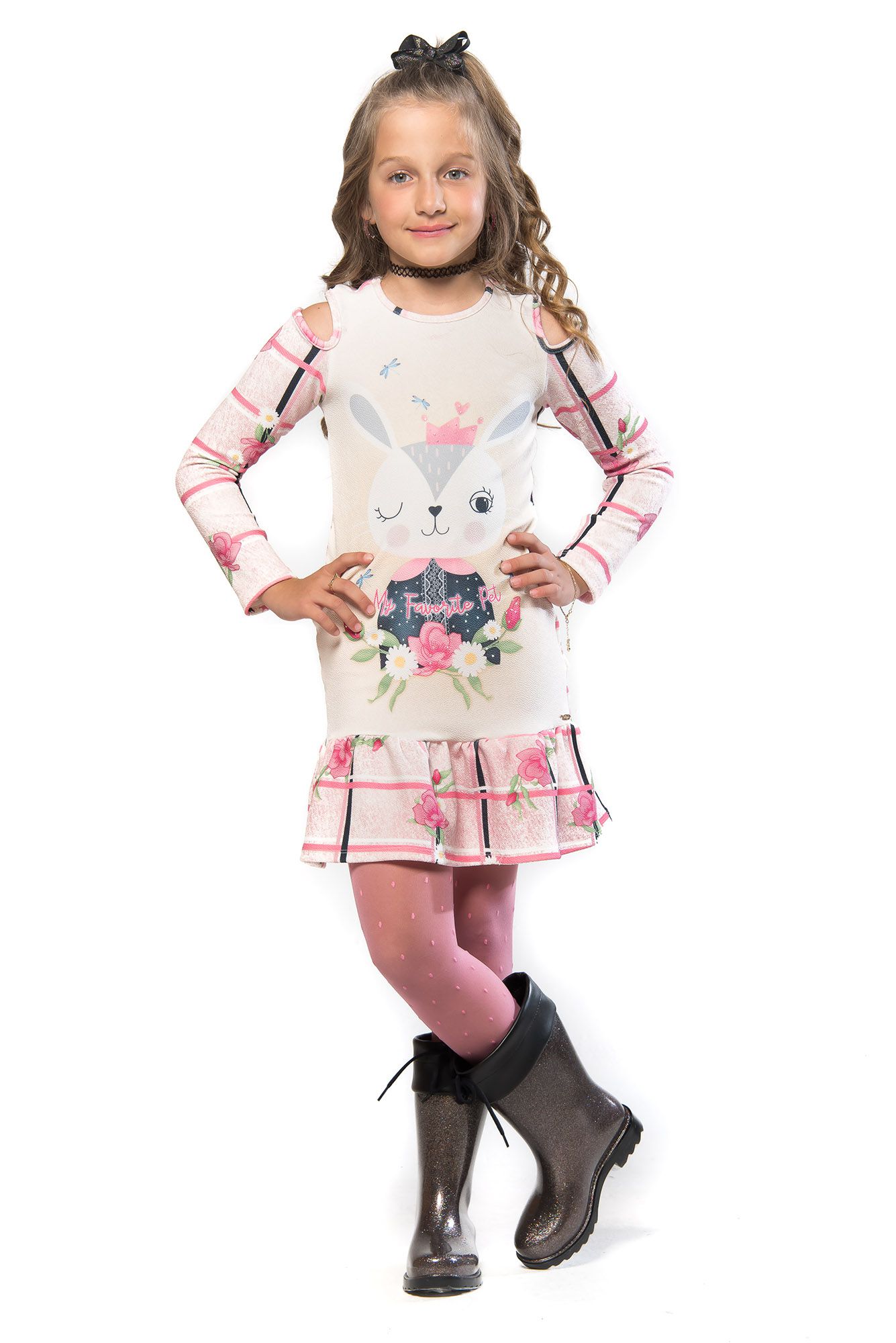 Vestido manga longa, com detalhe ciganinha nos ombros, gola redonda, com estampa de coelhinha, xadrez e flores, babados na barra.
